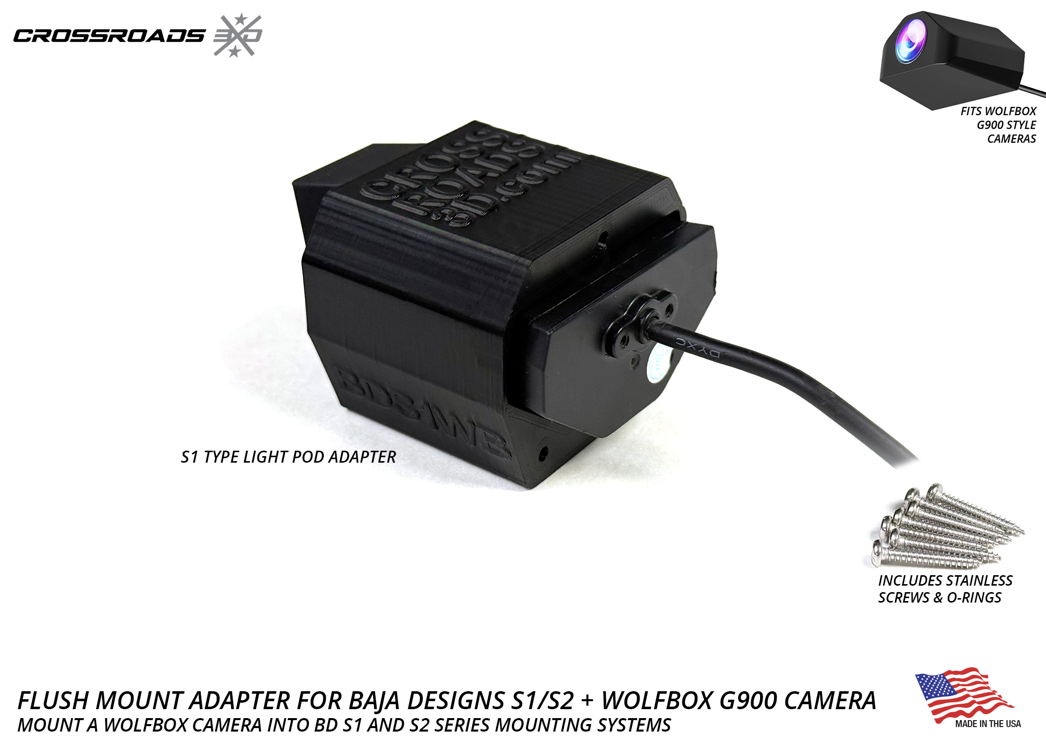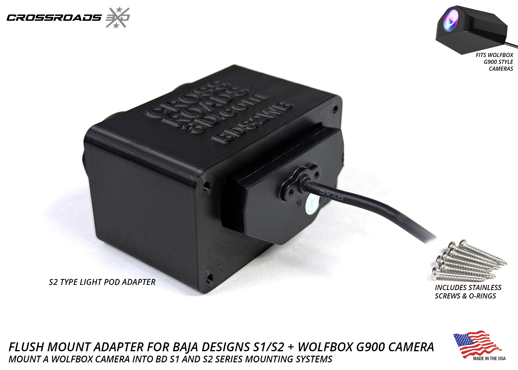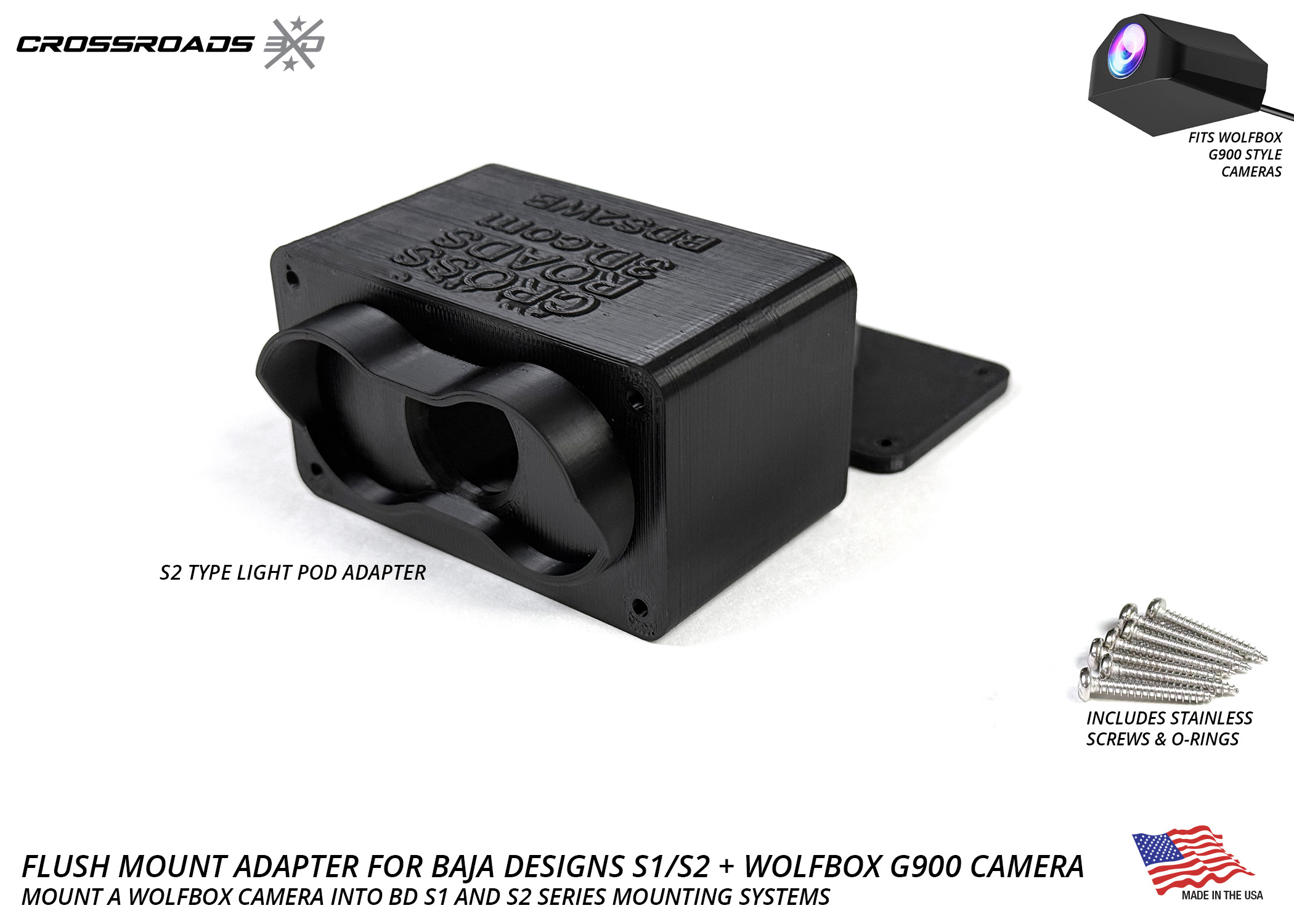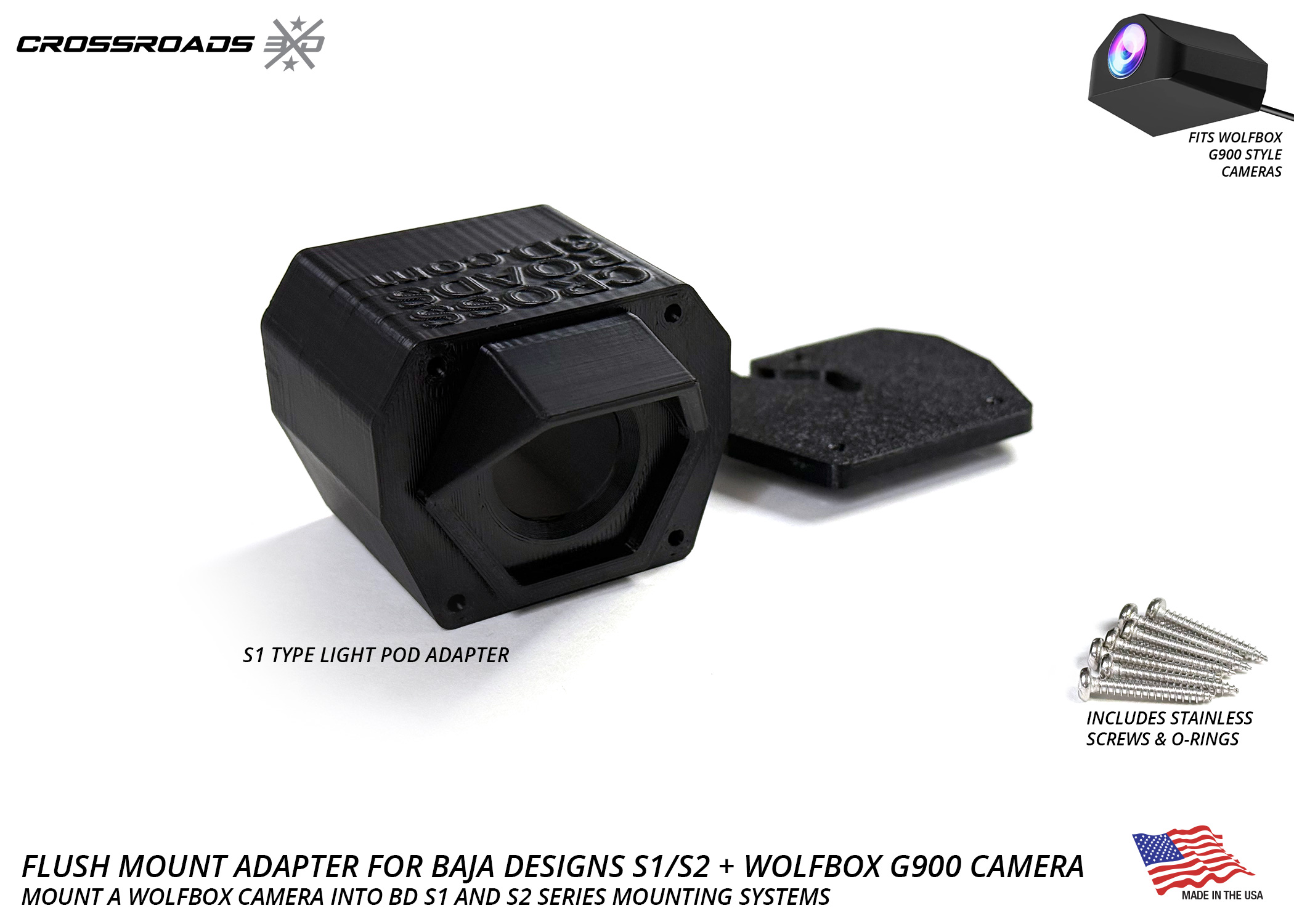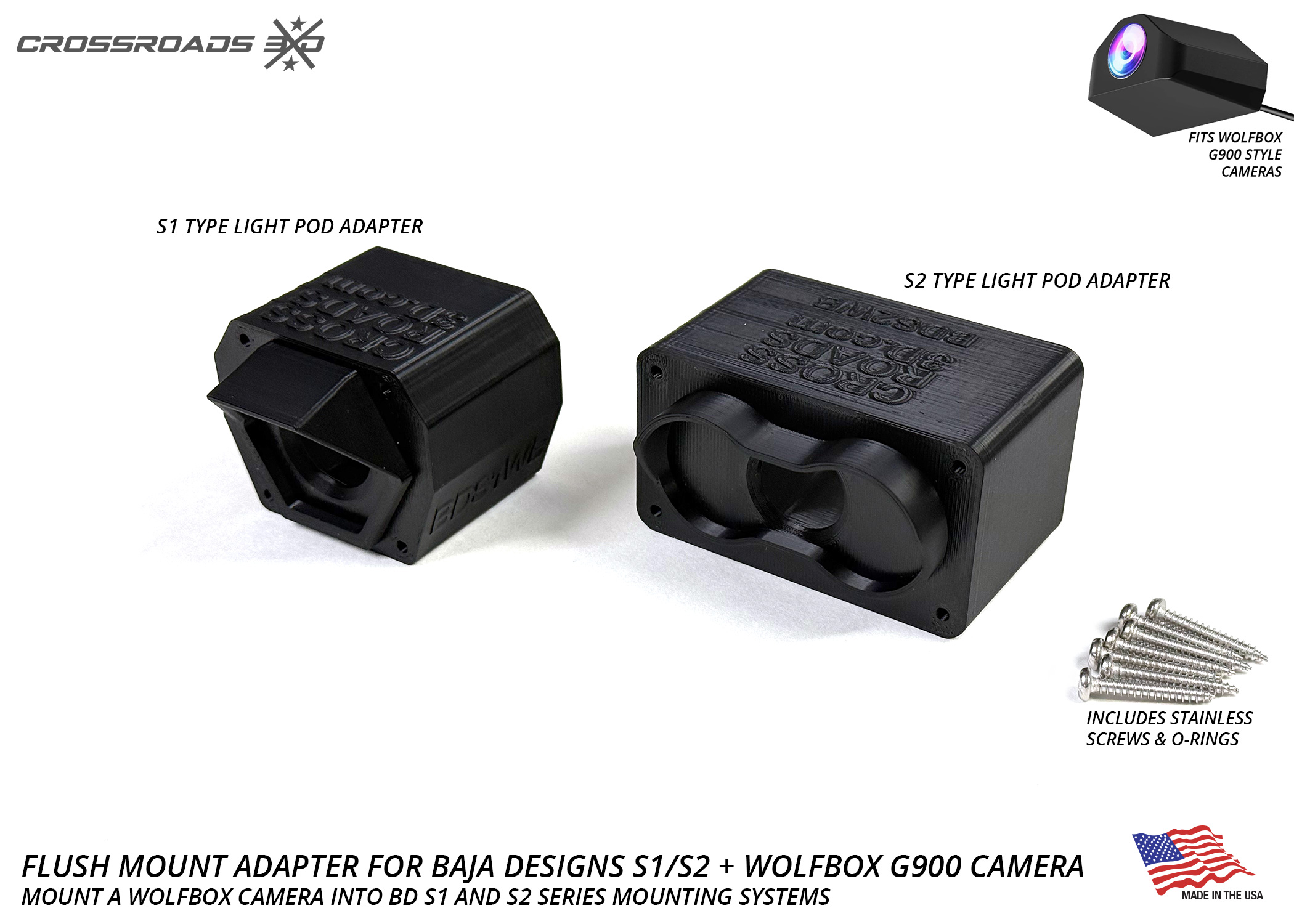 This adapter mounts a Wolfbox G90 style camera into any existing Baja Designs S1 or S2 flush mount light pod hole (common to light bars, horizontal/vertical tube mounts, universal a-pillar mounts, etc.) Perfect for off-road trucks, Jeeps, UTVs, and custom builds wanting integrated, durable fulltime digital rearview camera placement without new drilling.