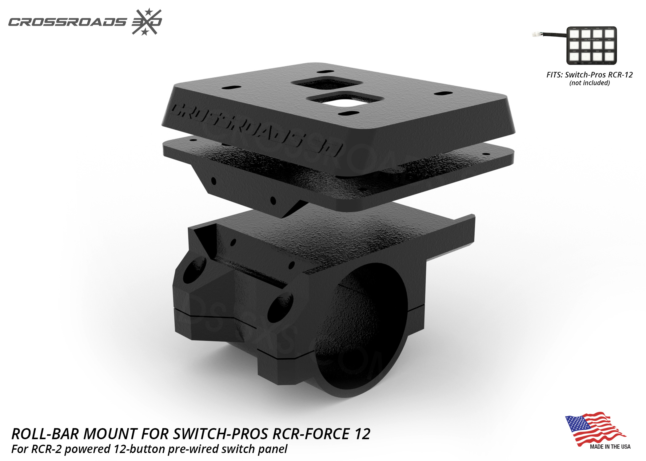 This bar mount for the Switch-Pros RCR-12 12-button powered switch panel. It gives you a secure mount on any round bar.