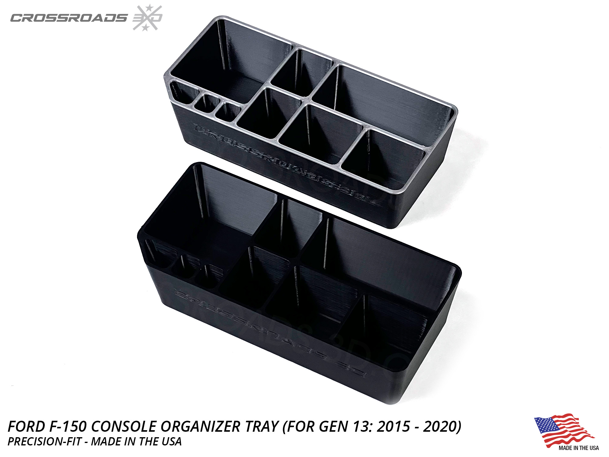 Crossroads 3D Console Tray Organizer for Ford F-150 (13th Gen, 2015-2020) pickups adds convenience and usefulness to the driver's side pocket in the console.