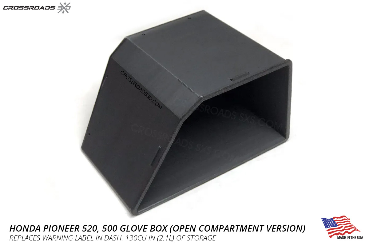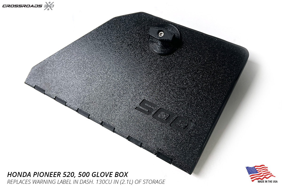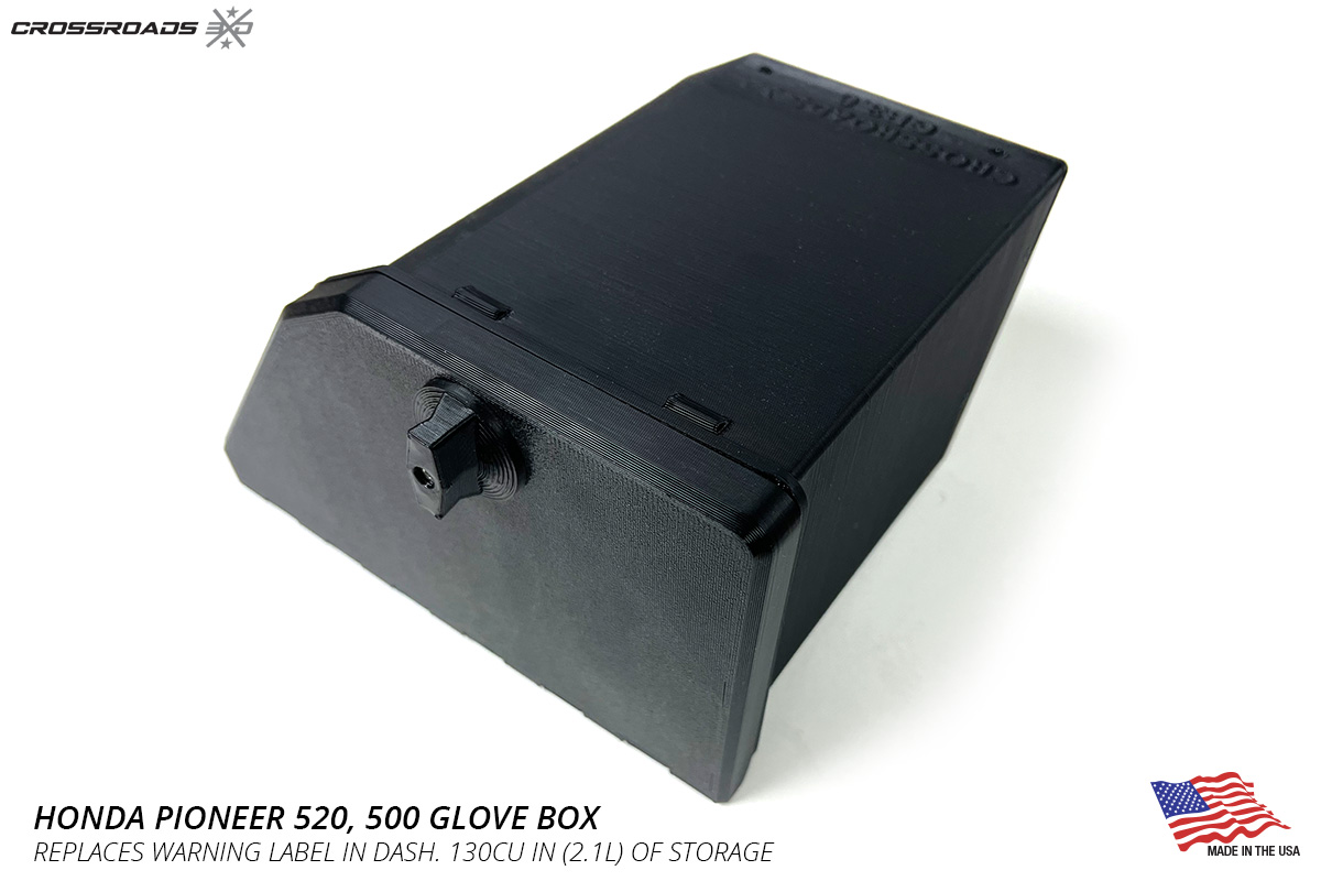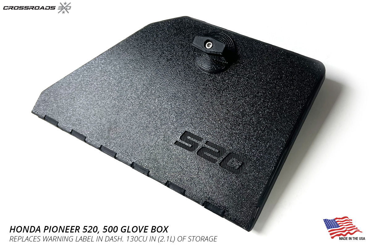 Get the Honda Pioneer 500 / Pioneer 520 Glove box for in-cab storage. The largest and most factory-looking aftermarket glove box available for the P500 or P520. This glove box adds 130 cubic inches of storage (2.1 L). It holds phones, gloves, ratchet straps, etc. This glove box replaces the warning label in the dash.