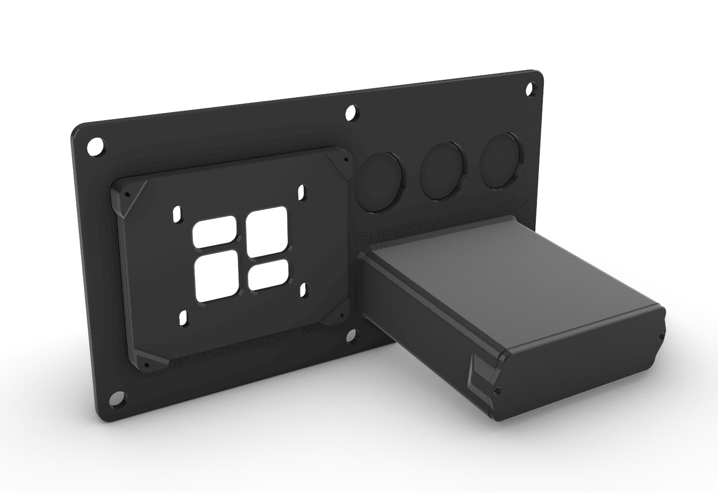 Electronics/switch panel for the Pioneer 1000 mounts the Switch-Pros RCR-Force 12 and 3 standard USB/voltage meter mounting. Round holes are “closed” with removable “knockouts.”