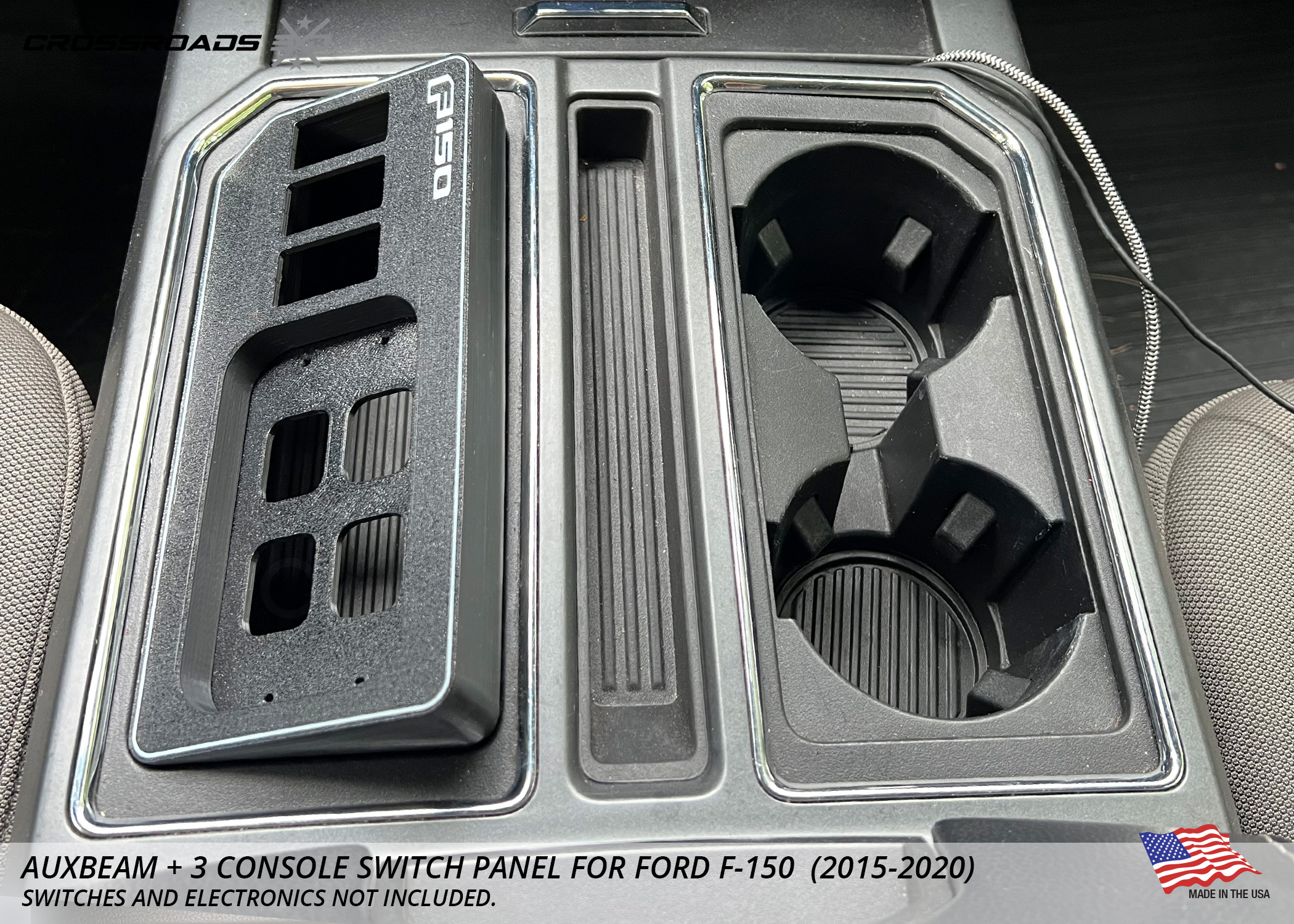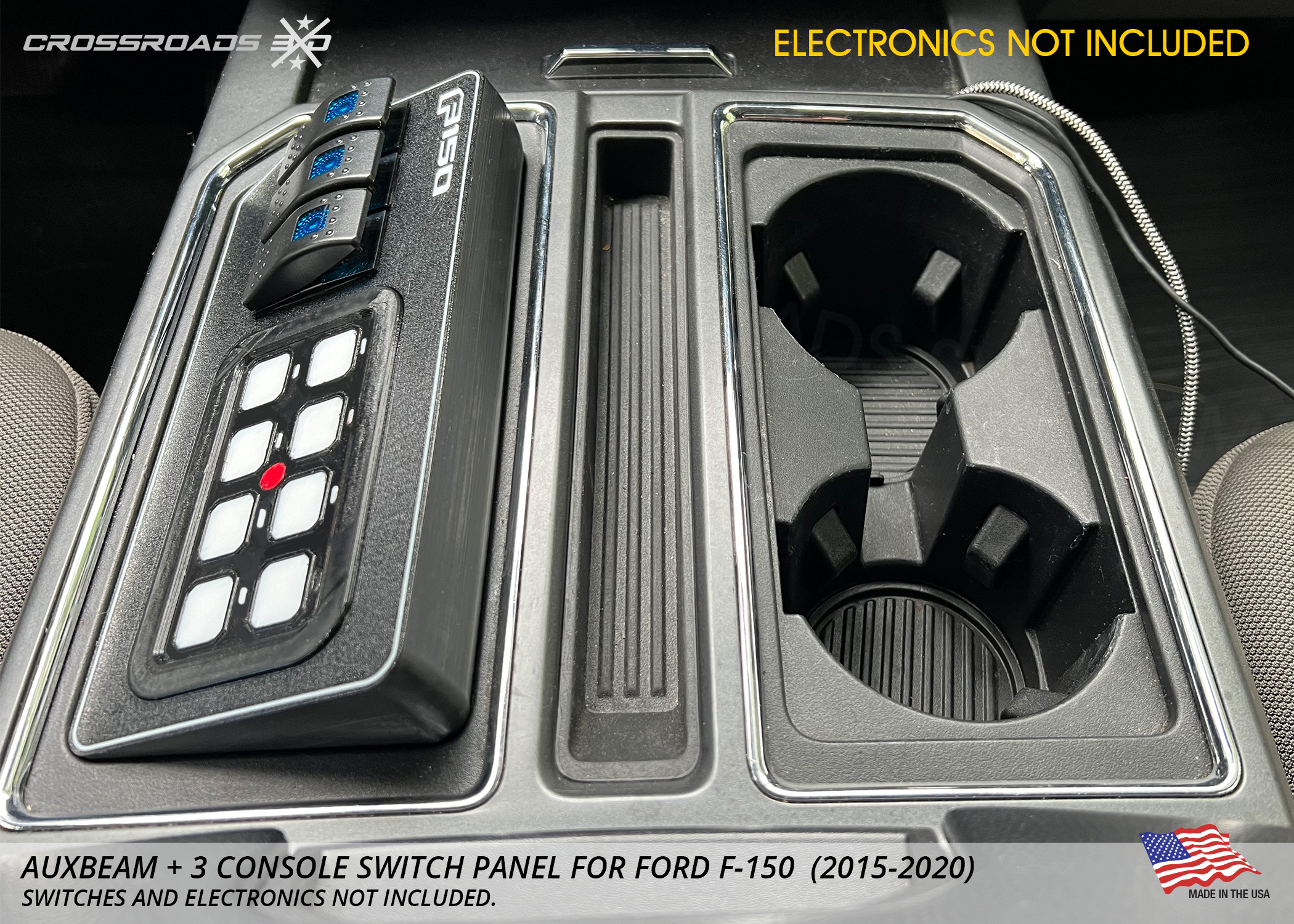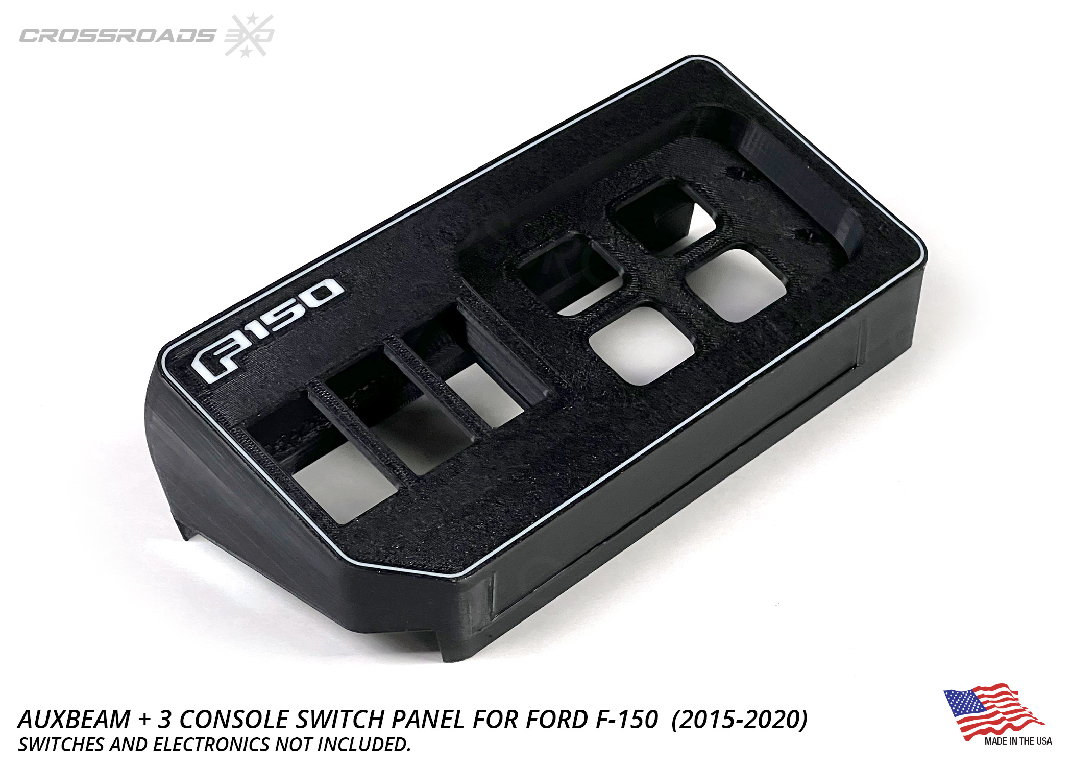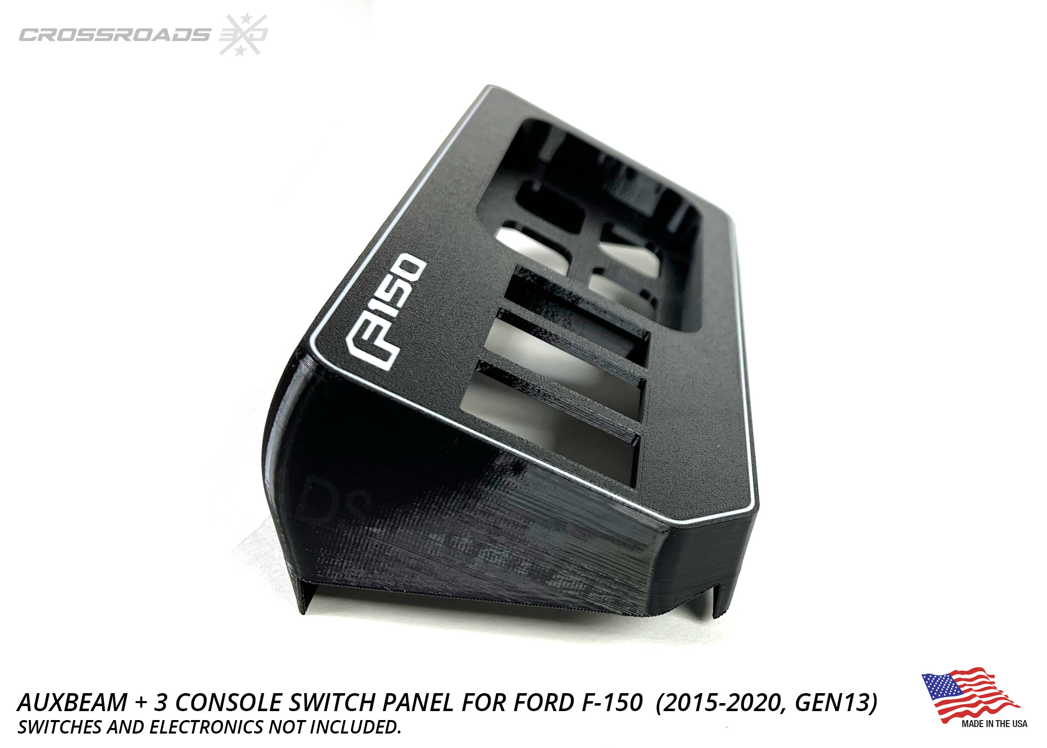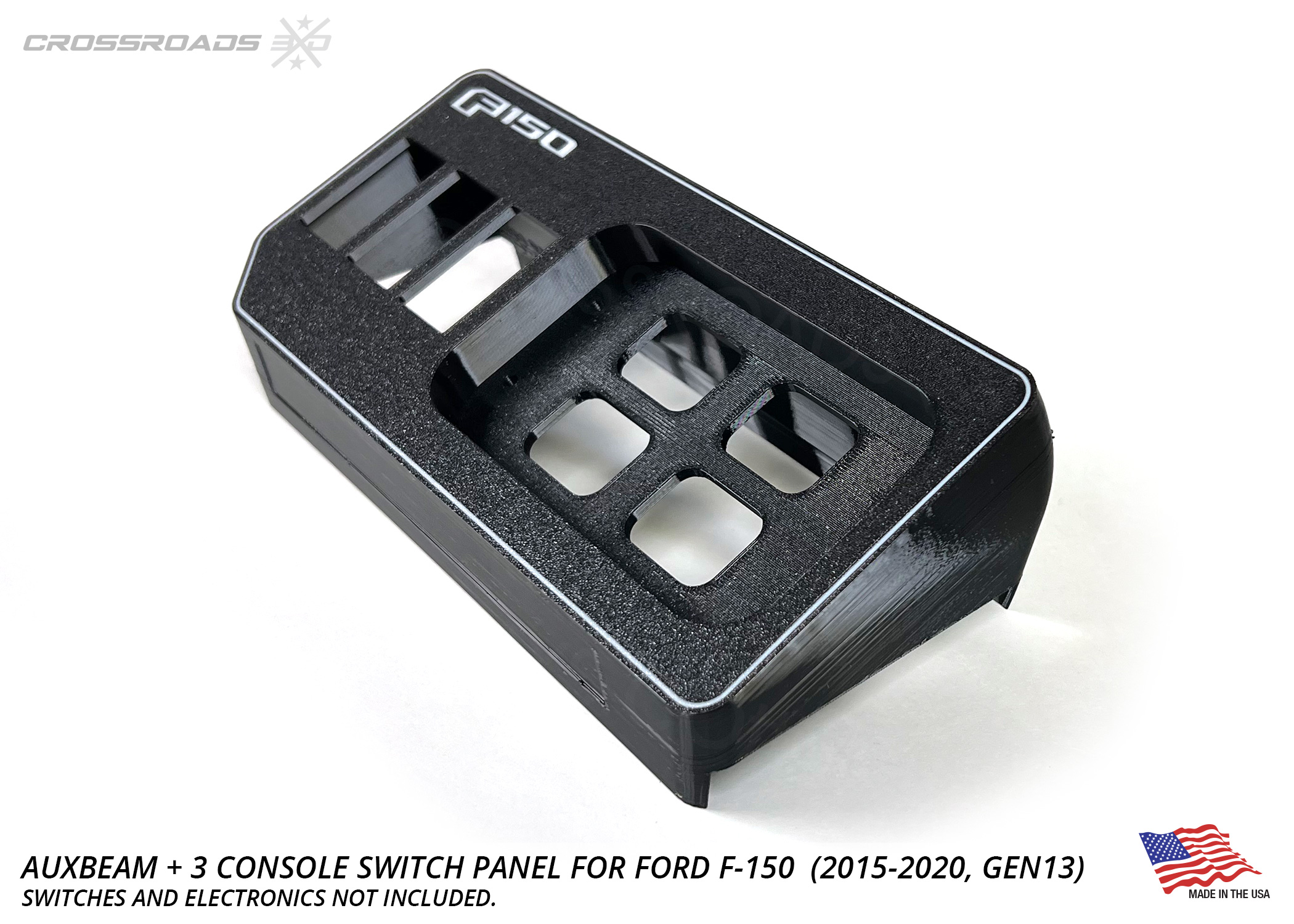Crossroads 3D switch panel mount for Ford F-150 (13th Gen, 2015-2020) mounts the Auxbeam 8-gang switch panel and three rocker switches. It's a great accessory to add control to the driver's side pocket in the console.