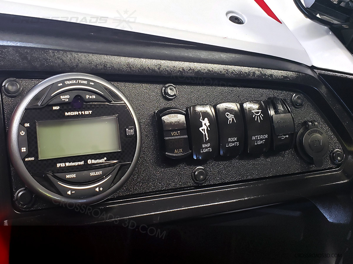 This switch panel fits the passenger side of the Honda Talon dash, replacing the warning label. Choose from various electronics layouts, which hold standard sized rocker switches and circular USB/voltage meters. The large round circle is 3″ for bluetooth radio units. Panels comes with the slots “closed” with removable “knockouts.” Let me know if the notes if you want custom text.