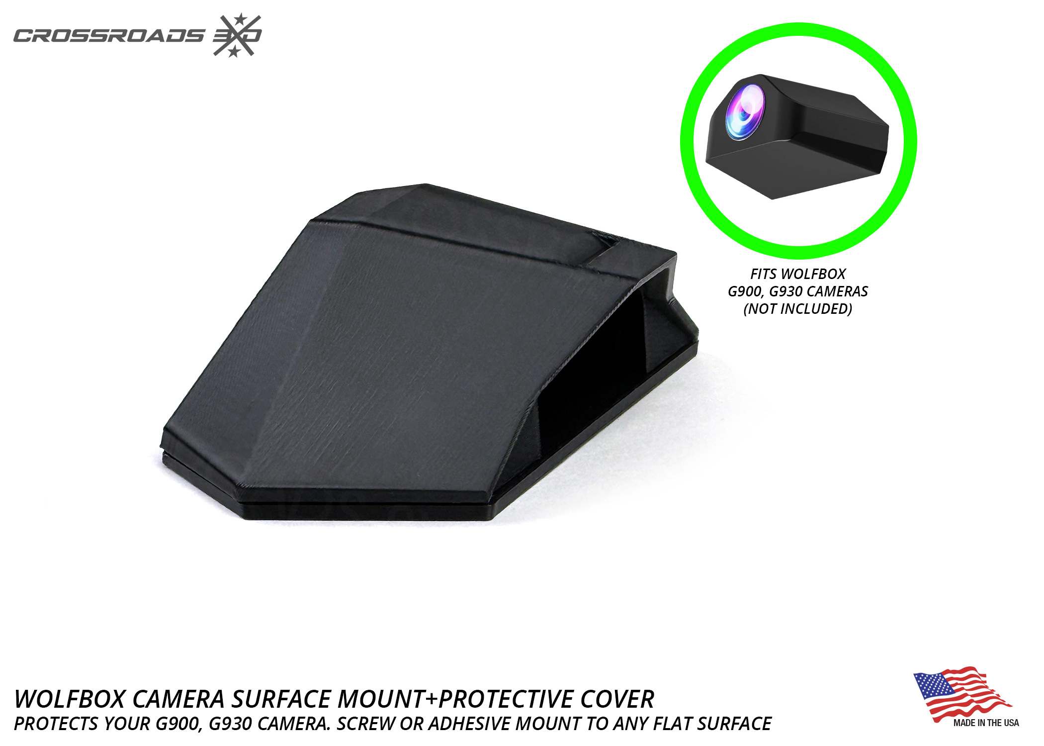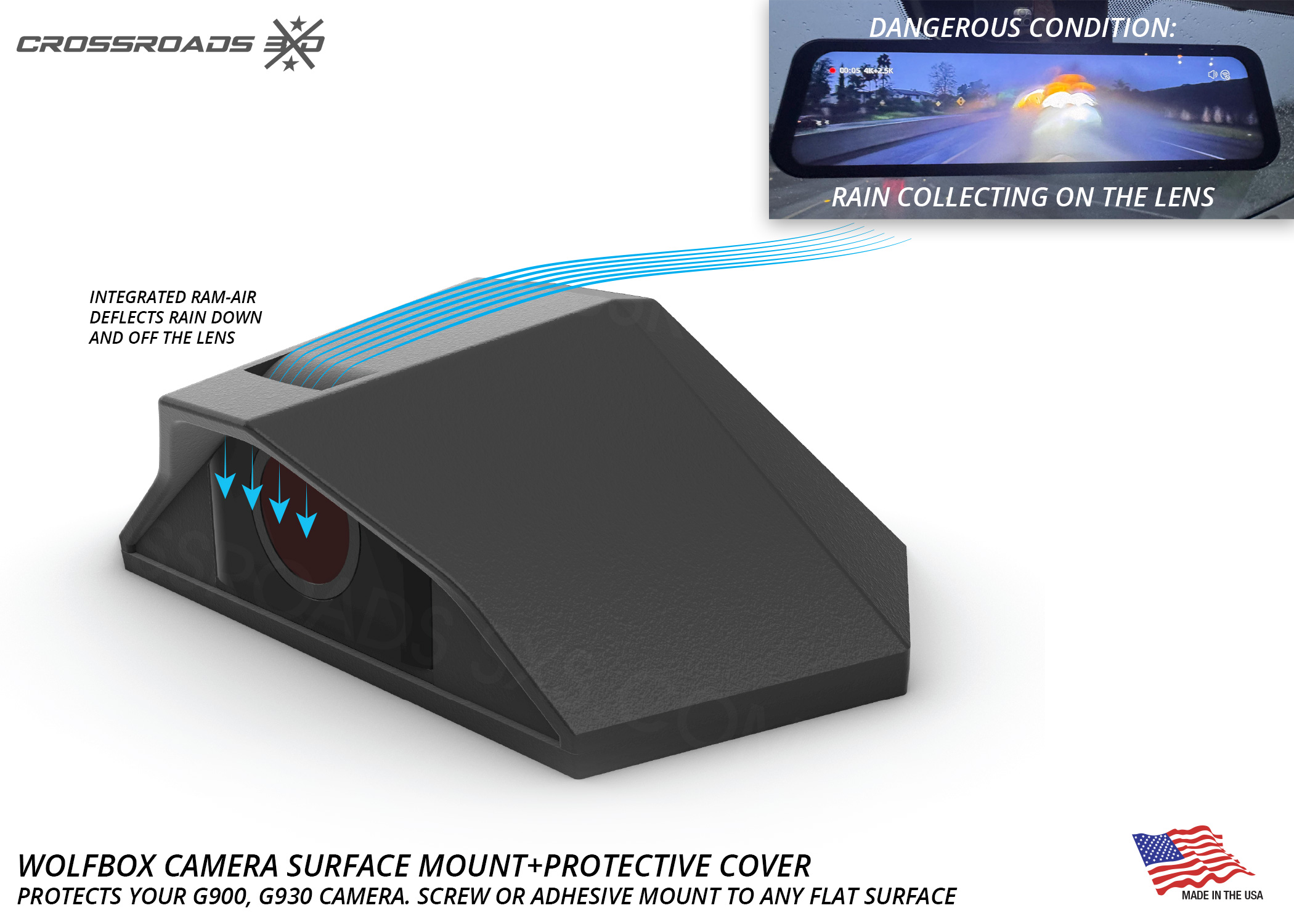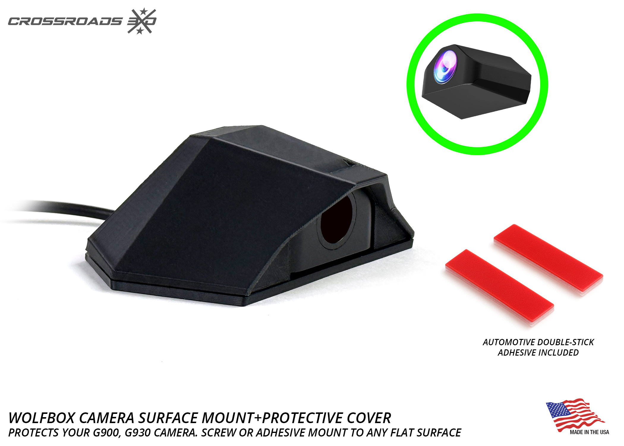 The Crossroads 3D Camera mount is precision-designed for the Wolfbox G900 / G930 style camera (not included.)